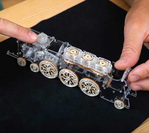 Especially we are proud of how the "front piston group" is arranged. This is the system of levers and shafts, which transfer the motion from the spring to the wheels. As the loco moving, you literally can see how this system makes the wheels turning by means of a simple spring. Owing to this part, we have managed to show the aesthetics and principles of real loco moving. While assembling this constructor, you will be feeling like a real 18th century engineer!
