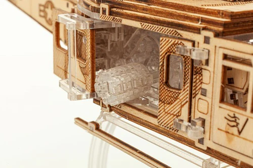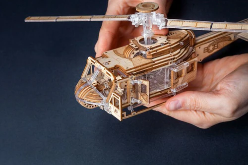 The Valkirja Helicopter 3D Puzzle by Viter Models is an advanced and high-quality mechanical model for self-assembly. This replica of the Bell UH-1 “Huey” helicopter, a famous aircraft from the Vietnam War era, features a wide range of functional units and realistic design details, making it a great choice for fans of military aviation and model building.Assembly of the Valkirja model is optimized for ease of use and does not require glue. The kit includes a helipad that is operated by a spring drive to simulate helicopter takeoff.The model includes various realistic functionalities, such as rotating main and tail rotors, a working turbine engine, a functional cargo compartment door, and steering wheels to change the angle of pitch. Additionally, the helicopter has a functional pad that simulates a real-world helicopter take off.Peculiarities: